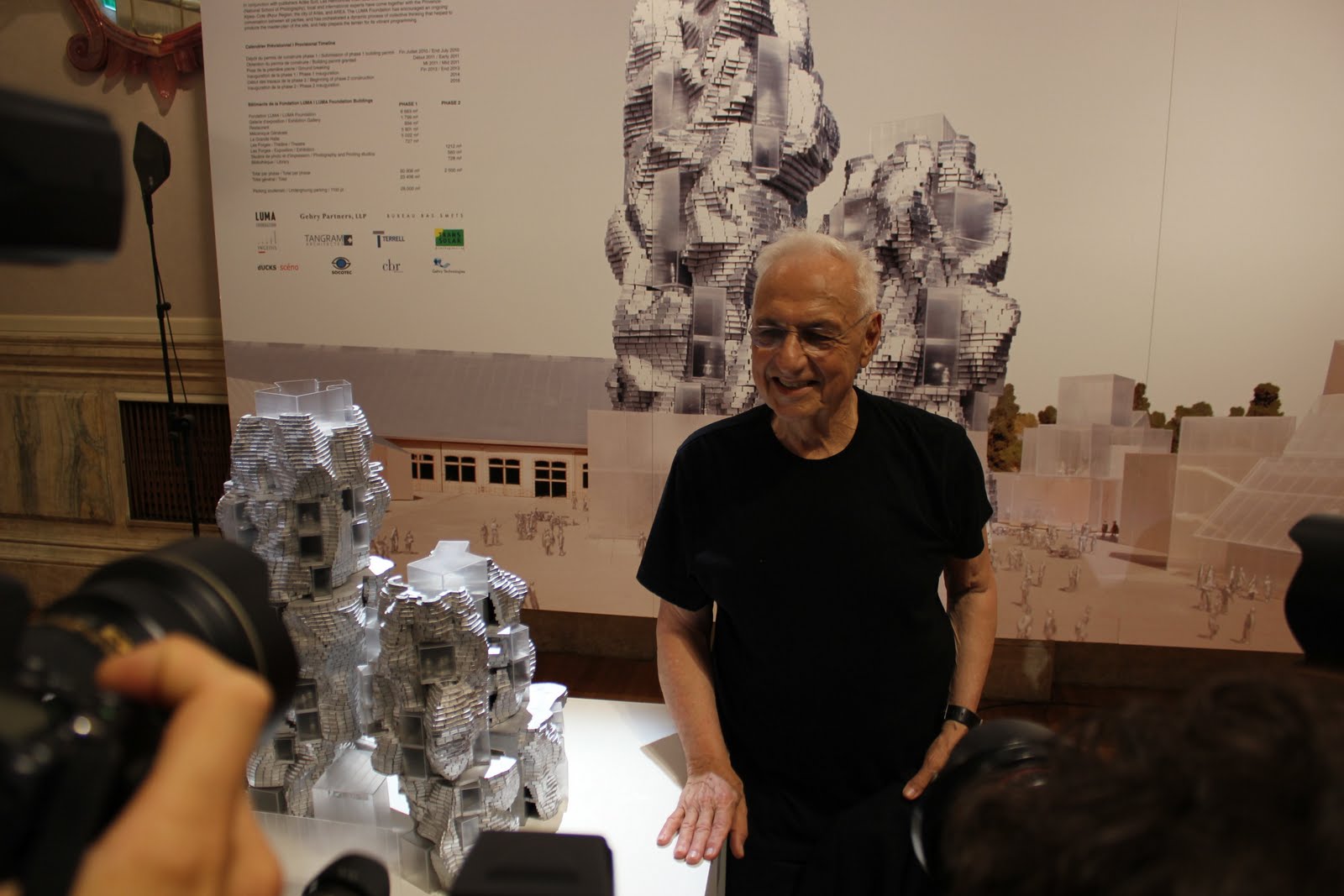 Una vez terminada la larga presentación Paolo Barata invito a subir a la recién restaurada Sala delle Colonne -una impresionante sala con frescos Venecianos- y en un instante, como quien pasaba por allí, apareció Frank O. Ghery. De estatura mediana y vestido de negro a la usanza de moda de arquitectos, como quien se dirigía haciendo un corto camino hacia la expo habilitada para la presentación de LUMA/Parc des Ateliers. La sala empetada de medios no hizo esperar su reacción y pronto Frank se fue fundiendo con un nutrido grupo de flashes hasta su pose a los fotografos junto a sus preciadas maquetas.