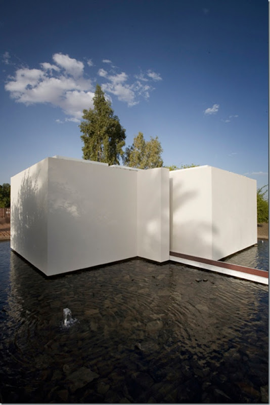 The prayer and meditation room is part of a centre for heart surgery in the Sudan, set up by a humanitarian organization. In reflection of the spiritual complexity of the country, the room is able to accommodate all religious persuasions. The architecture of the building incorporates local and traditional architectural techniques. It consists of two separate white cubes that are connected by a "palm leaf" [loose bamboo thatch] roof. The complex is surrounded by a water basin, creating a division between the macrocosmos of the hospital and the microcosmos of the meditation area.